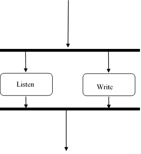 5. Concurrent Activity: some activities occur simultaneously or in parallel. Such activities are called concurrent activity. This is represented by a horizontal split (thick dark line) and the two concurrent activities next to each other and the horizontal line again to show the end of the parallel activity.