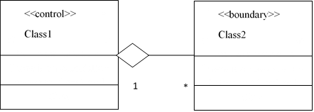 Class2 is part of Class1. Many instances (denoted by the *) of Class2 can be associated