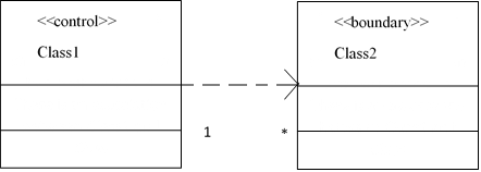 A dotted line with an open arrowhead that shows one entity depends on the behavior of another entity. Typical usages are to represent that one class instantiates another or that it uses the other as an input parameter.