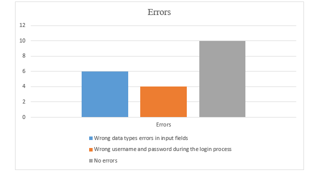 From the sample size of 20 the following has been analyzed on types of errors experienced during the registration and the login process. 6 out of 20 respondents reviewed that the system displayed errors when the user inputs wrong data variables in the text fields this was essential since the system clearly accepts the right data types. On wrong username and password during the login process 5 out of 20 respondents were denied access into the system since they input wrong usernames and passwords this was essential since the system has full implemented the access controls where by non-registered members cannot have access into the system. 10 out of 20 registered users experienced no errors since they input the right credentials to the system.