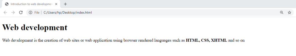 <p> Web development is the creation of web sites or web application using browser rendered languages such as<b> HTML, CSS, XHTML</b> and so on </p>