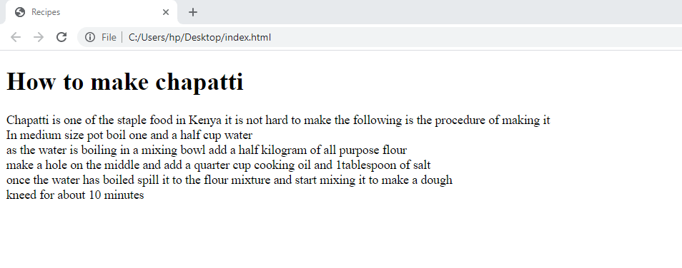<p> Chapatti is one of the staple food in Kenya it is not hard to make the following is the procedure of making it <br /> In medium size pot boil one and a half cup water <br /> as the water is boiling in a mixing bowl add a half kilogram of all purpose flour <br / > make a hole on the middle and add a quarter cup cooking oil and 1tablespoon of salt <br /> once the water has boiled spill it to the flour mixture and start mixing it to make a dough <br / > kneed for about 10 minutes <br/> </p>