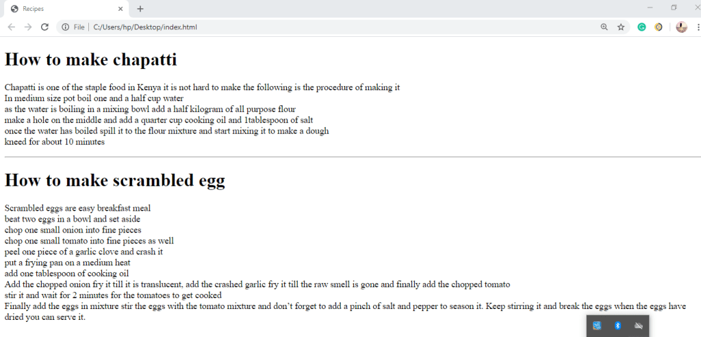 <p> Scrambled eggs are easy breakfast meal <br /> beat two eggs in a bowl and set aside <br /> chop one small onion into fine pieces <br /> chop one small tomato into fine pieces as well <br /> peel one piece of a garlic clove and crash it <br /> put a frying pan on a medium heat <br /> add one tablespoon of cooking oil <br /> Add the chopped onion fry it till it is translucent, add the crashed garlic fry it till the raw smell is gone and finally add the chopped tomato <br /> stir it and wait for 2 minutes for the tomatoes to get cooked </br> Finally add the eggs in mixture stir the eggs with the tomato mixture and don’t forget to add a pinch of salt and pepper to season it. Keep stirring it and break the eggs when the eggs have dried you can serve it.